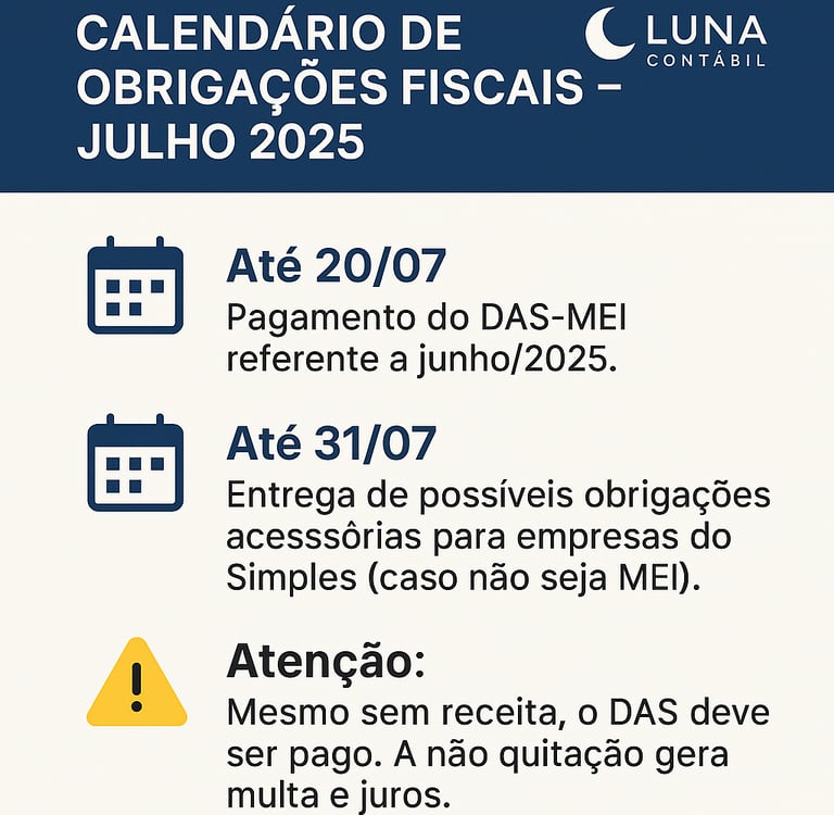 Confira os principais prazos fiscais para MEIs e empresas do Simples Nacional no mês de julho de 2025. Evite multas e mantenha sua empresa em dia com a Receita Federal!
